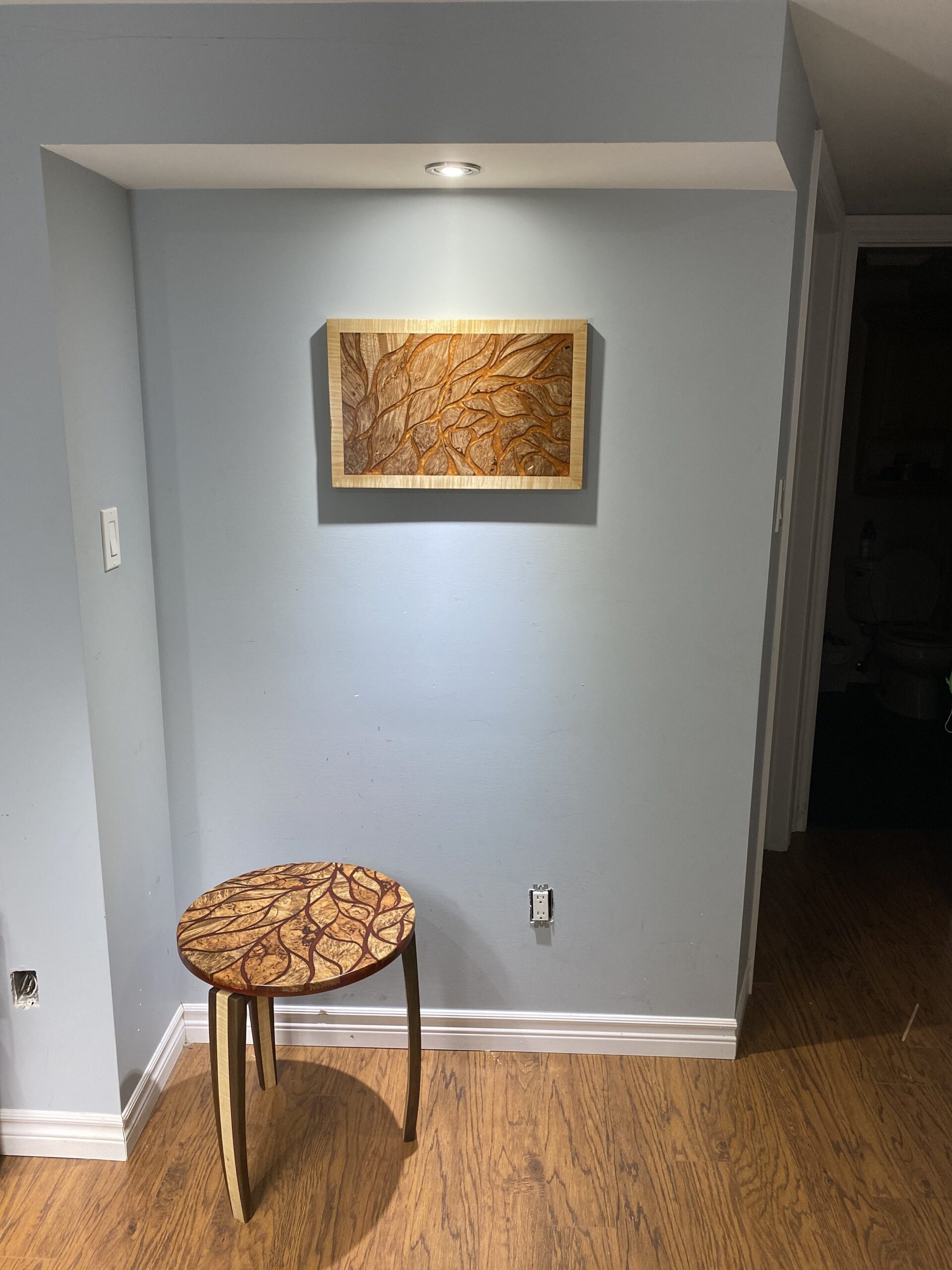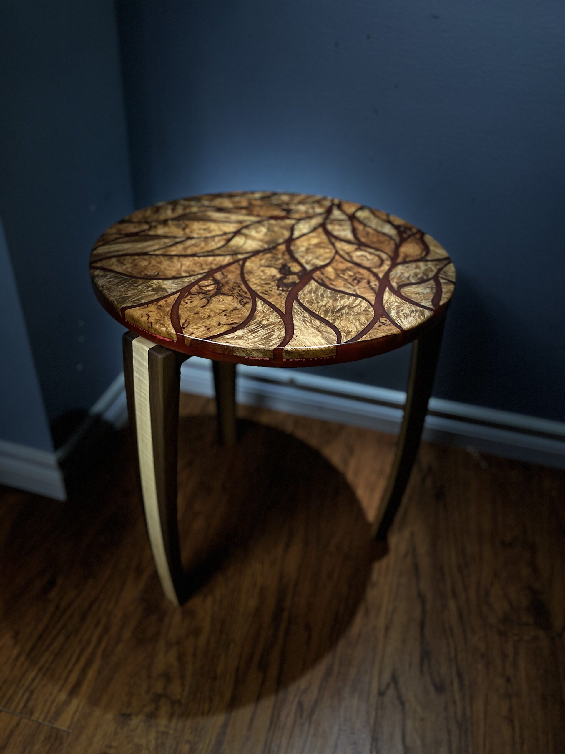 This one of a kind end table is made with carefully selected bigleaf maple burl , set in resin, the pattern is hand made with each piece being cut and placed. The legs feature curly maple and Black Walnut personally harvested from the Halliburton Highlands in Ontario.